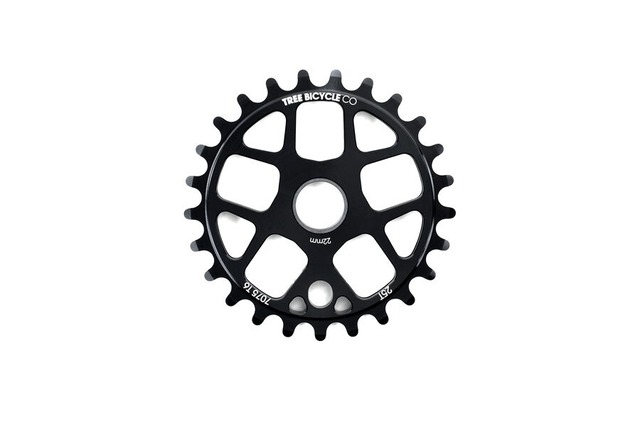 2000年代初頭に7075-T6アルミ製スプロケットを定着させたTREEが、 2007年に2つの大きな特徴を持つLITE SPROCKETをラインナップへ加えました。 まずは「アイ・ビーム・シェイプ」。 スプロケットの外周から中心にかけてCNCによって大きく穴あけ加工され、それだけでも十分に軽量に見えますが、TREEはさらにその側部も切削加工することでセリフ大文字の「I(アイ)」のような形状に仕上げ、強度を維持しながらも軽量化しています。 アイ・ビーム・シェイプはスプロケットを効率的に軽量化できることから、LITE SPROCKETの登場後、その他のブランドからも同様の切削方法を採用するスプロケットがラインナップされるようになりました。 LITE SPROCKETは、ボルトドライブとスプラインドライブと2通りの固定方法が用意され、ボルトドライブは22mm径を標準として19mmスピンドル用のアダプターが付属。 スペック カラー BLACK 素材 7075-T6アルミ 対応スピンドル BOLT DRIVE : 19mm & 22mm ※19mmは付属スペーサーで対応 厚み 7.94mm サイズ 25T 重量 73g (25T)