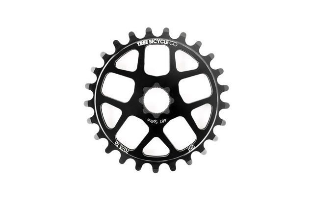 2000年代初頭に7075-T6アルミ製スプロケットを定着させたTREEが、2007年に2つの大きな特徴を持つLITE SPROCKETをラインナップへ加えました。 まずは「アイ・ビーム・シェイプ」。 スプロケットの外周から中心にかけてCNCによって大きく穴あけ加工され、それだけでも十分に軽量に見えますが、TREEはさらにその側部も切削加工することでセリフ大文字の「I(アイ)」のような形状に仕上げ、強度を維持しながらも軽量化しています。 アイ・ビーム・シェイプはスプロケットを効率的に軽量化できることから、LITE SPROCKETの登場後、その他のブランドからも同様の切削方法を採用するスプロケットがラインナップされるようになりました。 2つ目がSPLINE DRIVE(スプライン・ドライブ)。 スプロケットの中心に48本のスプライン(溝)を備えるクランクのスピンドルと噛み合うアダプターが装着され、ボルトを使用することなく装着できる画期的な仕組みです。 それまではスプロケットとクランクとの固定方法はボルトによるものが一般的でしたが、ライディングの頻度によってボルトが緩むことがあり、それによりスプロケットのボルト穴が広がりガタが生じたり、緩んだボルトによってクランクのねじ山を破損してしまうことがありました。しかしボルトを使用しないSPLINE DRIVEではそれを解消。 現在では減少したものの、TREEに続いてSPLINE DRIVEのスプロケットがその他多くのブランドにもラインナップされるきっかけとなりました。 LITE SPROCKETは、ボルトドライブとスプラインドライブと2通りの固定方法が用意され、ボルトドライブは22mm径を標準として19mmスピンドル用のアダプターが付属。スプラインドライブは、48スプラインの19mmスピンドル用と22mmスピンドル用がラインナップされています。
