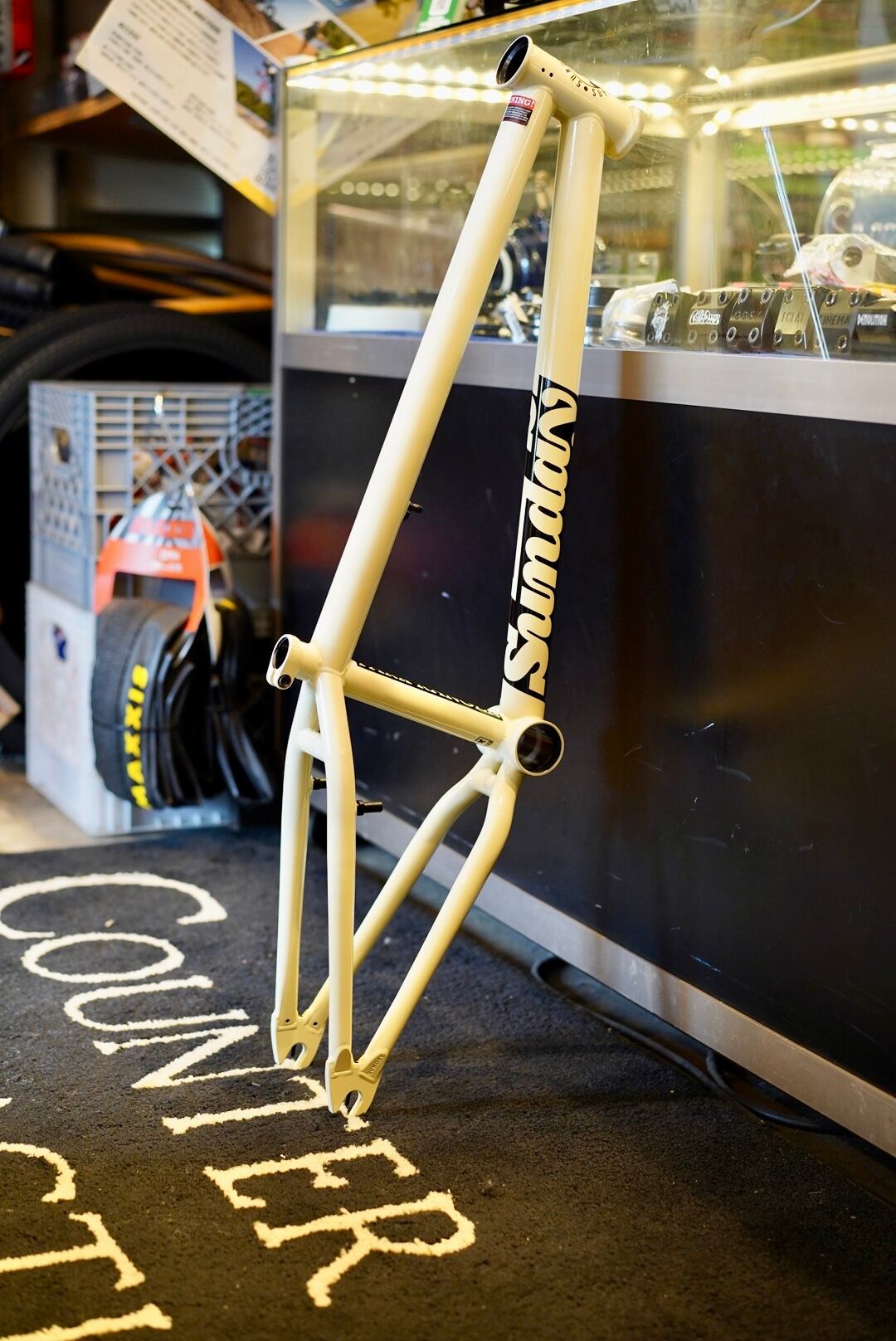 チェーンテンショナーを内蔵した中空ドロップアウト、そして大幅に低いスタンドオーバーハイトが特徴的なフレームとなっています。