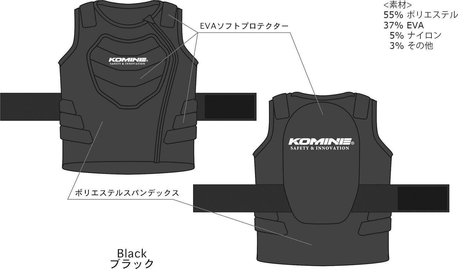 ・ ヘルメットや肘プロテクターしながらでも着用させやすいベストタイプの軽量なプロテクターです・ お手持ちの服の下に着られるインナープロテクター・ 胸、背中、脇腹、肩をEVA 製衝撃吸収フォームパッドで保護します・ 特に重要な部位である胸部と脊椎は硬さの異なる2 種類のEVA を重ねた二層式のプロテクターを装備・ 胸部プロテクターはオートバイ業界でも重要とされる胸部中心を保護できる一枚型を採用し、転倒時のハンドルバーによるダメージを軽減します・ベスト本体は速乾性の伸縮スパンデックス生地を使用し、プロテクターが身体に密着しずれくくします・ お子様の成長に合わせてフィット感の調整ができるウエストベルトは用途により着脱可能です・偽造防止4D ラベル採用